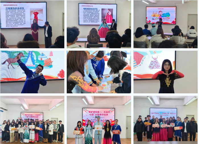 本次活动紧扣“休戚与共、荣辱与共、生死与共、命运与共” 的共同体理念,创新设计 “理论宣讲 + 文化体验 + 互动实践” 三维活动体系。政策宣讲环节,通过 PPT 专题解读、典型案例分享等形式,系统梳理中华民族多元一体格局的历史脉络,深入阐释 “五个认同” 的核心内涵,让同学们深刻理解 “民族团结是生命线” 的深刻意蕴;民族文化展示区里,各族员工身着特色服饰自信亮相,详细介绍服饰背后的历史渊源与文化寓意,精美的刺绣、独特的纹样引得现场阵阵赞叹;民族知识竞答环节围绕民族政策、历史文化、地理风貌等内容展开,同学们踊跃抢答、激烈角逐,在趣味比拼中夯实民族知识基础;绘制 “民族团结同心圆” 活动中,大家携手执笔,将56个民族的文化符号、祖国大好河山等元素融入画作,用色彩勾勒 “中华民族一家亲” 的美好愿景;风采展示环节,歌曲演唱、诗词朗诵、民俗表演等节目轮番上演,生动展现了各民族文化的独特魅力与交融之美,现场氛围热烈融洽。
